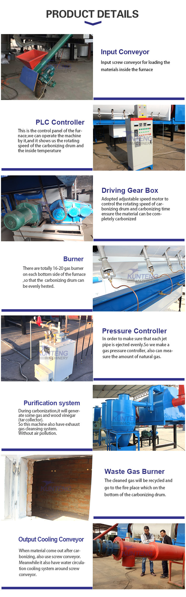 Equipment also match purifi-cation system, during carbonizing, generate combustible gas will be cleaned up and return furnace to heat itself. This machine is fully automatic , it has a PLC control cabinet , no need worker when its working.