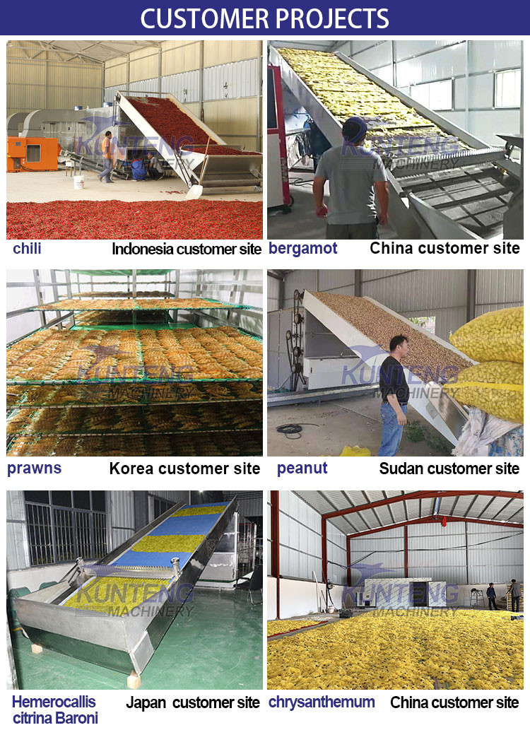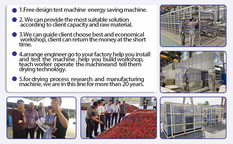 KUNTENG company was founded in 1999. We have been engaged in manufacturing all kinds of Industrial dryer machines, Mesh belt dryer,Heat pump dryer,and a series of food process machines for many years.We got more patented technologies and honor. Our machine has passed ISO9001:2000CCC,CE certification, We provide customers with a one-stop service of design solutions, complete equipment, on-site installation,and after-sales support.Welcome to cooperation.
