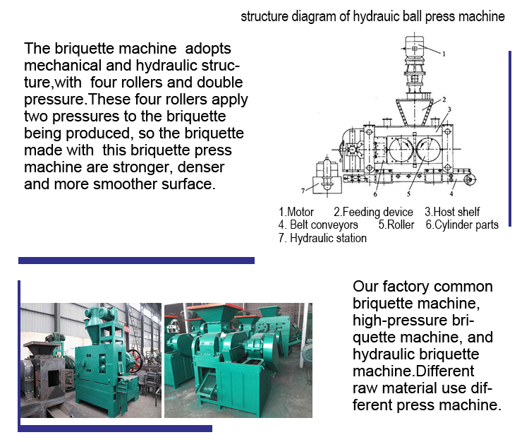 The machine is opposite rollers squeezing press,can making powder materials briquetting into ball, pillow, oval,round,square shape,etc. According to different powder materials, We can provide different pressures models of ball press briquetting machine.