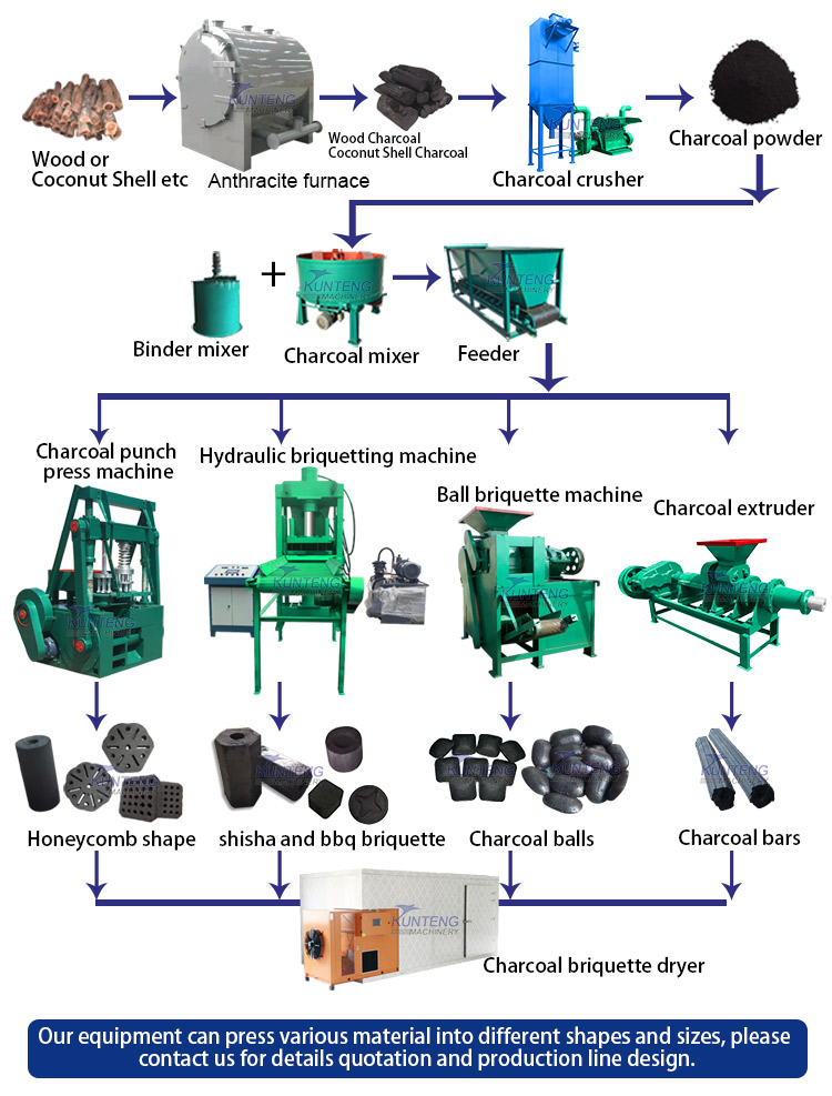 In the end, charcoal powder can be formed into ball, cylinder, tables and cubic by briquette machine and enter the dryer by drying.