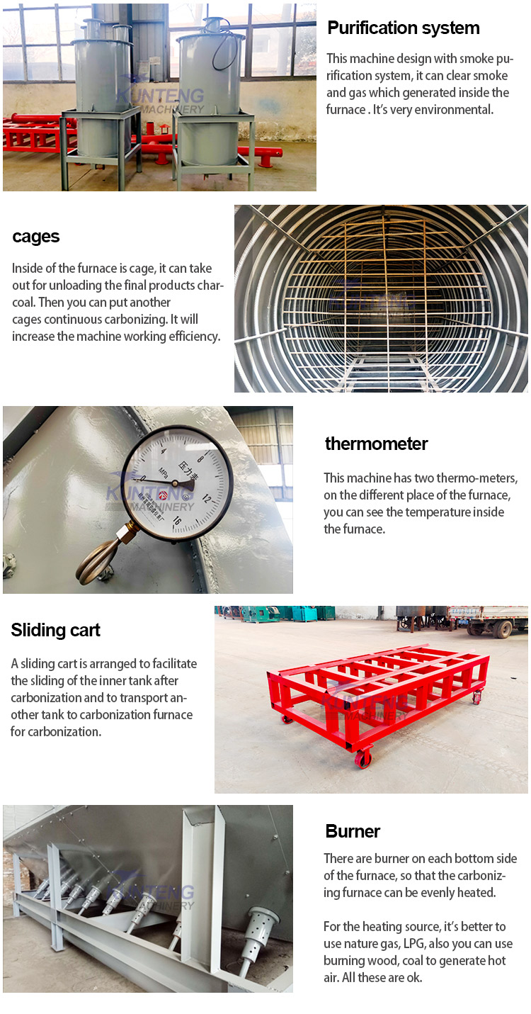Wood log biochar charcoal machine, bio charcoal making machine and barbecue charcoal machine can use different material as heating source.Such as the waste wood, coal, gas, natural gas, liquefied gas, combustible gas(produced during the carbonized process)