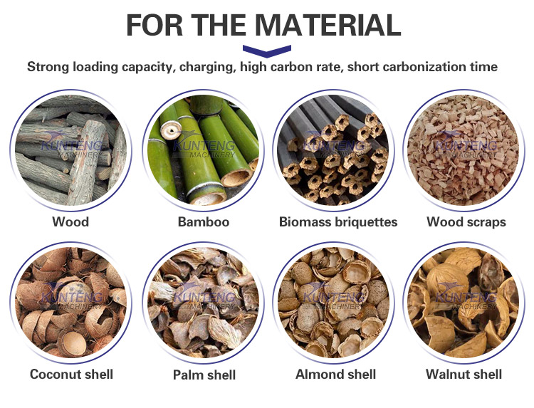 Raw materials of Wood log biochar charcoal machine, bio charcoal making machine and barbecue charcoal machine can be rice husk, coconut shell, wood, biomass, some crops, bamboo, waste wood, branches, trunks, logs, bark, stumps, roots, wooden pallet, sawdust, shavings, wood chips, fruit wood, rice husk, corncob, peanut shell, furfural residue, palm shell, semi-coke and etc.