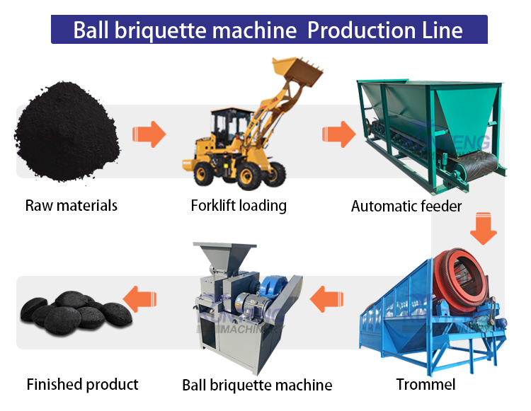 Chemicals / Mineral / Metal Ore Powder / Steel Slag / Coal Charcoal materials are grinded into powder by our dust-free grinder---automatic feed into trommel machine---dry powder are pressed to different shapes by our Dry Powder Ball Press Briquetting Machine,--after drying and packing can be send to market for sale.
