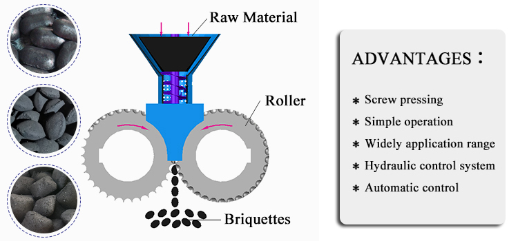 The machine is opposite rollers squeezing press,can making powder materials briquetting into ball, pillow, oval,round,square shape,etc. According to different powder materials, We can provide different pressures models of ball press briquetting machine.