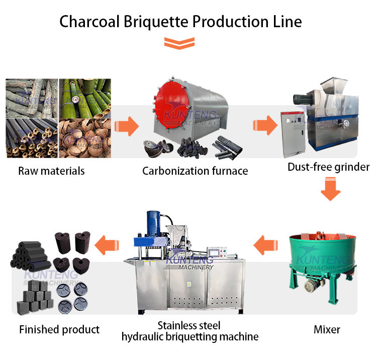 We can also provide the whole production line for you.If your raw material is big wood,such as tree branch,coconut husk,bamboo,ect.,you can refer to the below production line:Horizontal charcoal furnace-Dust free grinder-Mixer-charcoal briquette making machine-BBQ charcoal.