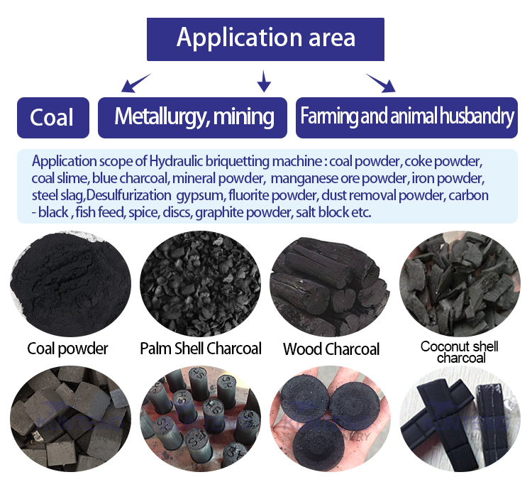 The Hydraulic Charcoal Briquette Making Machine is suitable for molding powder materials, coal powder, carbon powder, mineral powder,etc., by replacing the mold can be made into a variety of shapes of finished products.