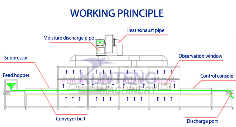Our microwave dryers use electricity, the materials are fed into feed hopper then conveying into the microwave heating chamber. The microwave directly interacts with the materials, converting high-frequency electromagnetic waves into heat energy. Use electromagnetic and biological effects to sterilize and dry materials both internally and externally, and heat evenly.