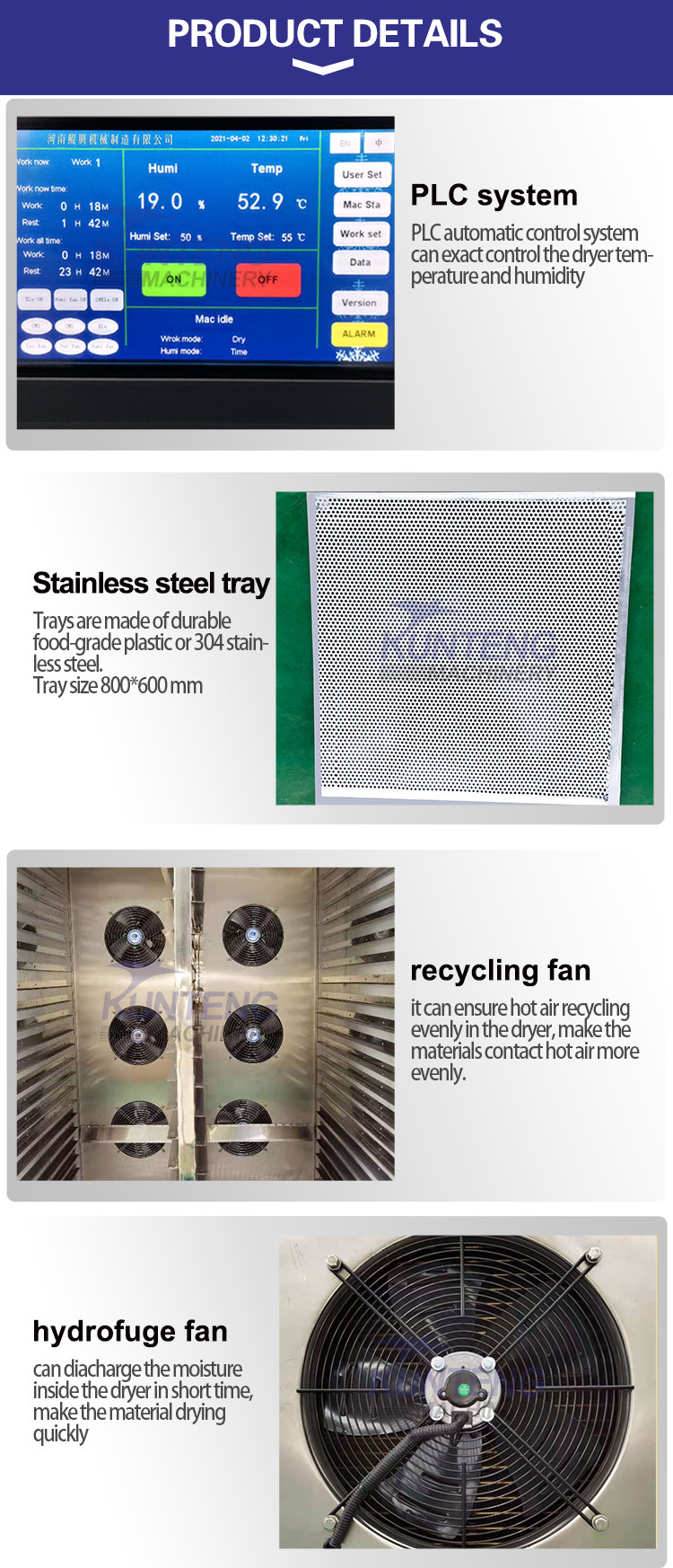 KUNTENG company was founded in 1999. We have been engaged in manufacturing all kinds of fruit and vegetable drying machines for many years.We got more patented technologies and honor. Our machine has passed ISO9001:2000,CCC,CE certification, We provide customers with a one-stop service of design solutions, complete equipment, on-site installation,and after-sales support. Welcome to cooperation.