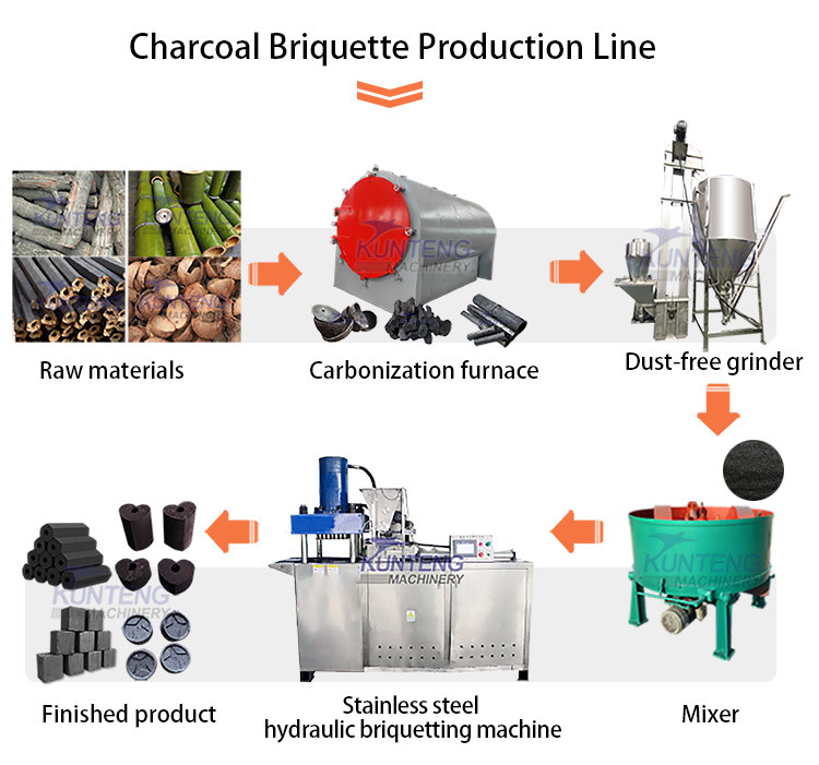 KUNTENG is a professional manufacturer of hydraulic briquette extruder machine,coal/charcoal briquette machine,briquette machine charcoal machine,we have more than 20 years of rich experience,we can design and produce whole shisha/bbq charcoal briquette production line,We provide customers with one-stop services from design, production, shipping,installation,and training how to operate,please feel free to tell us your requirement.