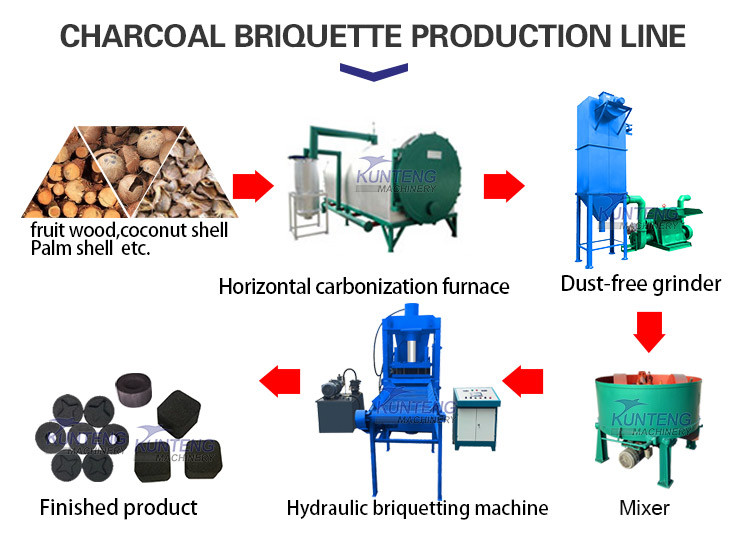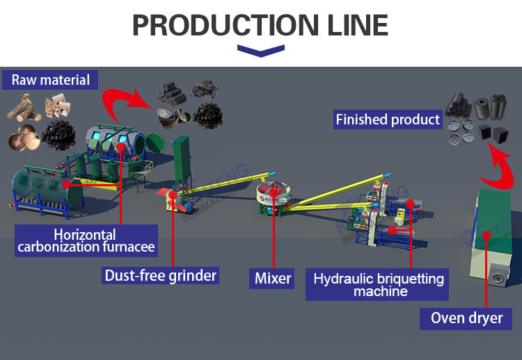 In the end, charcoal powder can be formed into ball, cylinder, tables and cubic by briquette machine and enter the dryer by drying.