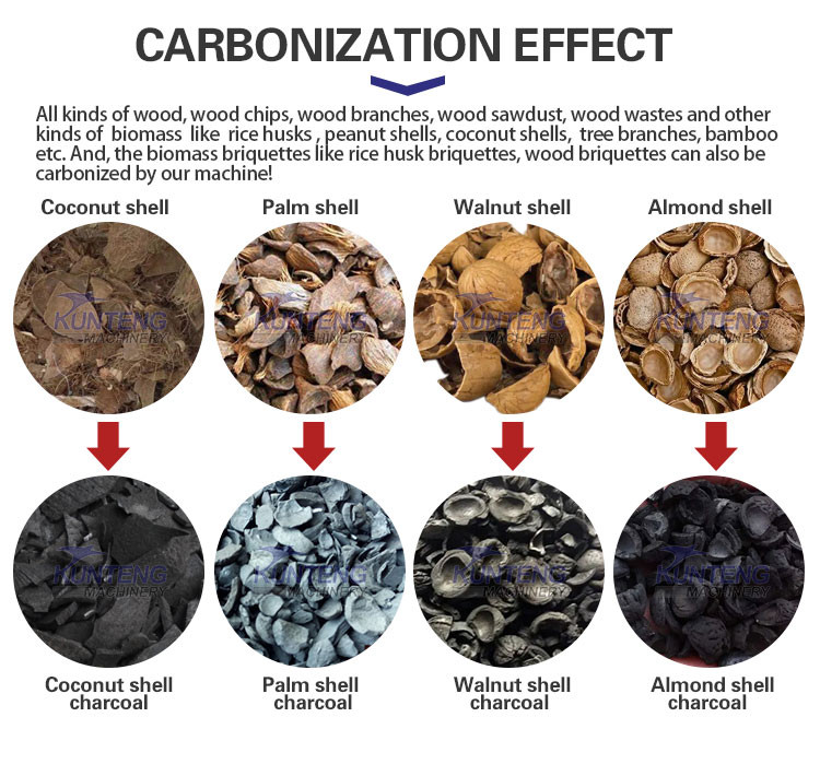 Rice husk, Palm shell, Wood log, Coconut shell, sawdust, bamboo or other biomass can be carbonized into rice husk charcoal, palm shell charcoal, coconut shell charcoal, bamboo charcoal, sawdust charcoal, biomass charcoal by carbonization equipment.