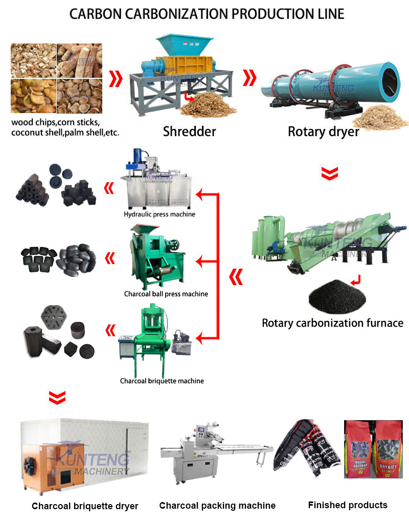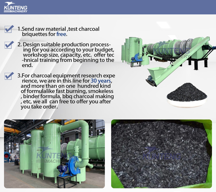 KUNTENG is a professional manufacturer of charcoal briquette making machine.we have more than 20 years of rich experience of design and produce whole charcoal production line,We provide customers with one-stop services from design,production, shipping,installation,and training how to operate,please feel free to tell us your requirement.