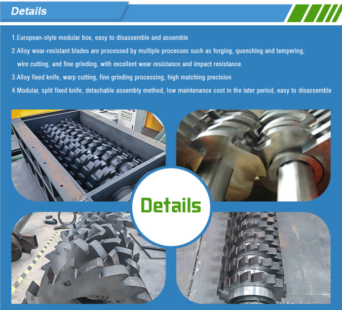 1. Stable performance with low noise and dust generation 2.Minimal maintenance 3.Safe and easy operation 4.Auto-reversing when engaging unshreddables 5.Free and professional blade design to make sure high shredding quality 6.Available for diffeent products,such as waste plastic,rubber,tyre,wood,metal,cardboard,paper,coconut,stone,pvc pipe,grass