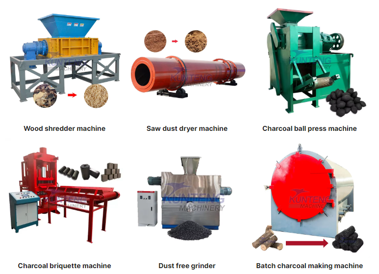 Wood scraps, coconut shell, corn sticks,bamboo scraps,etc, are crushed by shredder machine---Rotary dryer drying sawdust (if the moisture ≤12% does not need to be dried), --- carbonized by Continuous carbonization furnace, --- Produced charcoal can be used for lithium ion battery electrode materials,or for fuel --- Charcoal briquette machine to make hookah charcoal,barbecue charcoal.