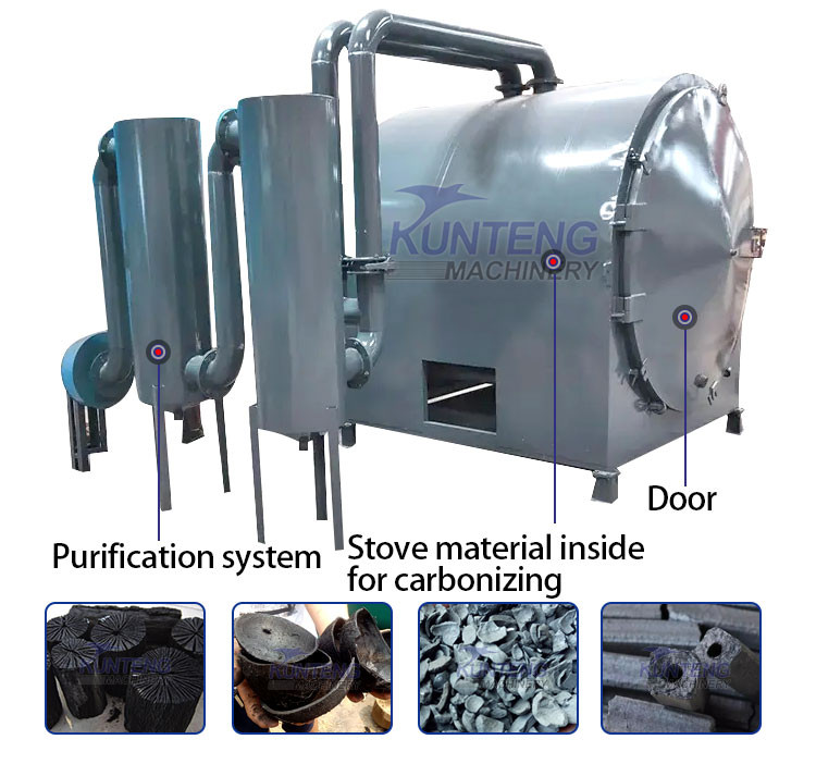 Wood log biochar charcoal machine, bio charcoal making machine and barbecue charcoal machine can use different material as heating source.Such as the waste wood, coal, gas, natural gas, liquefied gas, combustible gas(produced during the carbonized process)